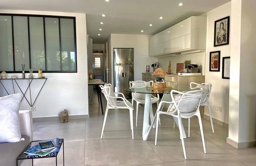 Just renovated and tastefully decorated, the villa "La Bohème" has two suites: a master suite with king size bed, private bathroom, dressing room, flat screen TV, Smart Tv Netflix, safe, air conditioning, ceiling fan, another smaller suite with a Queen size bed, walk-in closet, powder room, flat screen TV Smart TV Netflix, air conditioning, bluetooth fan, open kitchen fully equipped living room, fridge American distributor water, dishwasher, induction hob, microwave oven, traditional oven, toaster, blender, Nespresso coffee machine, electric coffee machine crockery for 6 people minimum, dining table chairs, bar, air-conditioned living room, fan, television screen Smart TV Netflix, the living room is open on a beautiful outdoor space with many tropical plants for your enjoyment the teak terrace lit at night quipée a living room lounge of a set meal table and chairs for 6 people with a sail shade and a parasol, two sun on the sand and much more ...
