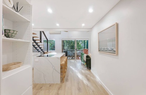 There’s a spacious feel with stone Island bench in the new kitchen, 2 large bedrooms with Queen beds and master has 50 inch Sony Smart TV. Upstairs is a loft to be used as a study or 2 sleep 2 more guests on the fold out couch if required. Living opens out to a private deck with a leafy outlook.