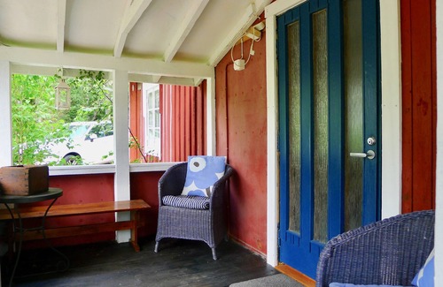 Recently renovated cottage on the sea shore is suitable for 2-4 persons. Open plan living/kitchen + one double bedroom with a super king (6ft) bed, bathroom with shower, hand basin and flush toilet. Kitchen fully equipped with dishwasher, fridge, oven, induction plate and microwave, electric kettle, coffee machine and toaster. Large sofa and armchair which can be replaced with 2 extra beds in the living room can make this cottage suitable for 4 persons. Also dining table and 4 chairs. Outside the porch offers seating, private terrace with grill and table plus seating. Outside space of 1h is shared with our other one bed rental cottage (Orchard Cottage at Solhem) and the owners house. This also includes the log sauna, hot tub, beach and pier. Parking adjacent to cottage. Row boat and bicycles are included. Small summer pub (2km) in next village and soon to open restaurant in our village. Eddy our friendly dachshund and Millie-cat live on site and lots of wildlife surround and sometimes visit us…