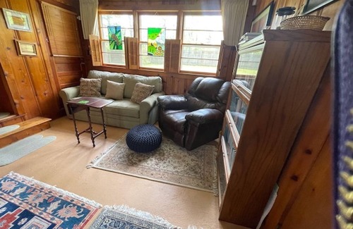 Cozy older home with oriental carpets, modern conveniences, WiFi, and wood paneling, surrounded by forests and privacy fencing. On the central campus of the University of the South with golfing, food services, and on-campus events within easy walking.