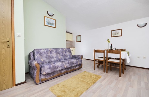 Apartment can accommodate 4 guests. Beds are situated in 1 sleeping rooms, but also in the living room, within 39m2. Guests can use a private terrace to enjoy the warm summer evenings. The apartment offers the sea view. Food can be prepared using barbecue which is shared with other guests too. Shared pool is on disposal during stay.