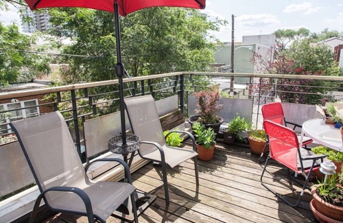 Off the bedroom is a deck with outdoor furniture where guests can enjoy a little outdoor green space in the city.