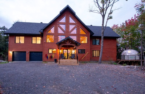 Two-acre Four season Property on lake Densa with large wrap-around deck, perfectly instagrammable One of a kind Clear dome for your all night star gazing sessions. 1:15 from Montréal, 15 minutes from Saint Sauveur, a half-hour from Mont Tremblant 2:30 from Québec. Sleeps 12 people 3 bedrooms Equipped kitchen Two Big dining tables Interior Sauna Wifi 2 full bathrooms 1 washrooms Pool table Baby change table BBQ Skating and walk on the lake Baby equipment available Bedding and towels provided
