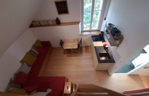 New little flat for two persons situated at the first floor of a barn, separarted from the owner's house in a large garden.