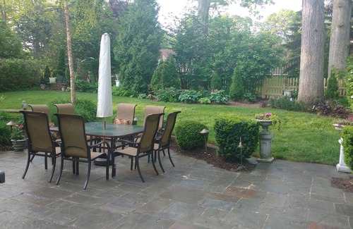 BLUE STONE PATIO, COMFORTABLE DINING CHAIRS, LARGE TABLE, SIDE SITITNG CHAIRS, An EASY TO USE NATURAL GAS GRILL AND NIGHT LIGHTING FOR RELAXING EVENING USE. STEPS TO THE POOL WHICH IS LOCATED BEHIND THE PRIVATE BACK YARD SCREEEND BY BEAUTIFUL FOLLIAGE AND EVERGREENS.THE POOL IS SHARED BY 3 HOMES. IT IS NOT A PUBLIC POOL. POOL OPEN MEMORIAL W/E THROUGH LABOR Day week