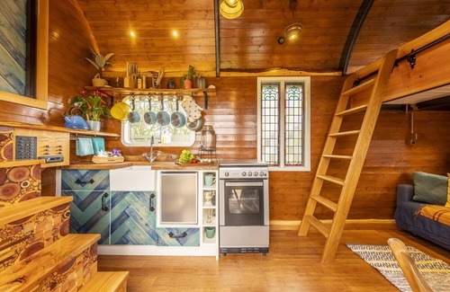 Dixie is made up of three parts; the main horsebox which is home to the living area, an undercover top deck attached to the horsebox and a separate bathroom. There are a set of steps heading up to the first floor decking where you are greeted by a set of french doors that lead inside to the living space. There is a fully-equipped kitchen with a fridge-freezer, four hob grill and oven and a large Belfast sink providing everything you need for cooking up a storm. There is a handcrafted yew slab with a couple of chairs, if you fancy dining inside; along with a wood burner sits opposite the kitchenette, stocked with logs to keep you toasty in the cooler evenings. To the rear of the lorry is a sofa and tucked neatly above, accessed by a ladder, is a king-size bed. Dixie is also complete with different lighting options, USB sockets and a Bluetooth sound system.