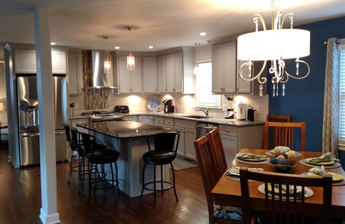 Our private home is basically new and restored to be a comfortable and relaxing place to stay. Perfect for small families and couples. Everything is open which is great for entertaining and just enjoying the openness of the place. The kitchen has all GE Profile appliances with granite counter tops and a wonderful kitchen island with four stools to sit around while visiting or preparing meals. The stove is a gas six burner with a griddle in the middle. The home even has a small air fryer and two coffee pots (both regular and Kuerig) The floors are all hardwood except for the master bathroom which is marble.