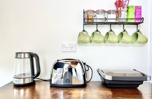 The building has three levels and the guest suite comprises the entire ground floor which has been newly restored. The suite layout consists of a private lounge with a king single bed, a spacious bathroom, kitchenette and a queen sized bed on the cosy mezzanine up the winding staircase. There are honeycomb blinds, which open from the bottom or top depending if you want light, the view or both. A new Fujitsu heat pump provides plenty of heating or cooling for Dunedin's diverse climate. A ceiling fan circulates air throughout the 4.5 metre-high original rimu ceilings and mezzanine.