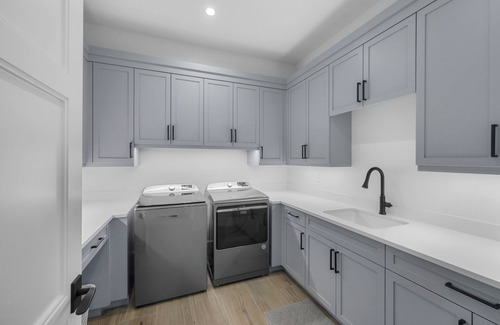 Inside, the expansive first-floor family room invites you to unwind on a plush sectional and chair arranged around a large television. Sliding glass doors open to the patio, blurring the line between indoors and out. The open kitchen, with gleaming quartz countertops and barstool seating, comes fully equipped with modern appliances and all the cookware you’ll need to prepare meals for the group. A formal wooden dining table offers canal views, while the breakfast bar makes casual meals easy.