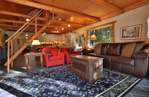 The cabin has two open loft bedrooms accessed by a 'ladder' stairway that can be lifted out of the way when not needed. Dogs and small children or anyone not comfortable navigating a 'ladder' stairway are not recommended/able to go up the stairs at this cabin. Please see photos as there are several photos of the stairway included.