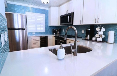 The all-new kitchen features stainless steel appliances including a dual temperature wine refrigerator. Guests are welcomed with a complimentary bottle of Prosecco. The space was reconfigured for a more open feel and finished with new cabinets, quartz countertops, and modern lighting. The new dining room table and chairs can accommodate up to six people.