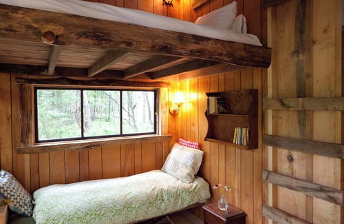 Tiny House 4 is a unique accommodation, built entirely out of recycled materials. It features a wall of antique windows which look out into the forest. Tiny House 4 has a sleeping loft with a full-size bed as well as a single day bed, for a total of up to 3 guests. There is a writing nook and a closet. There are electrical outlets and Wifi. There are fans for the summer and an electric space heater for early spring and fall. Tiny House 3 guests have a private firepit, charcoal grill, hammock and outhouse. They have access to the communal outdoor kitchen, outdoor shower with hot water on demand, and covered outdoor dining area. They also have access to the communal sauna. Available mid-April to mid-November.