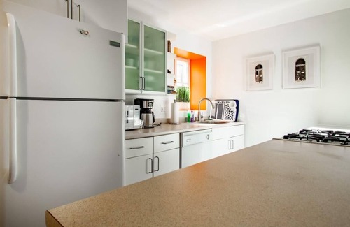There is a small dining area if you wish to stay in and prepare dinner in the fully-equipped kitchen, or have take out delivered. The kitchen includes the all essential appliances, including dishwasher and gas range, and is stocked with cookware, dishware, and utensils.