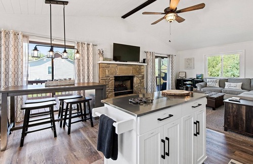 A compact package that delivers the goods, that’s what you’ll find waiting at Overlook Nook. This small but mighty 2-bedroom, 2 bath home certainly lives up to its name and you can see it from the moment you drive in, with its majestic view “looking over” the Great Smoky Mountains just a stone’s throw away. Even though this home is located in a small family-friendly neighborhood, don’t let the simple cottage style exterior fool you. The instant you walk into its living space, you are drawn in by the attention to detail and amenities maximizing the property’s smaller footprint with eye-catching artwork and modern furnishings in a refreshing clean space.