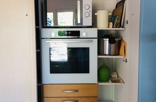 A well-equipped kitchen opens onto the living room: ceramic hob, extractor hood, fridge with freezer, dishwasher, washing machine, tumble dryer, large electric oven + microwave oven, plenty of utensils and crockery. Your garden is bordered by the terraced land and the pine forest.