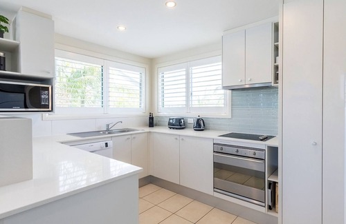 The modern kitchen is fully equipped with complete cooking appliances, microwave, dishwasher, and a Nespresso coffee machine with milk frother (BYO pods).