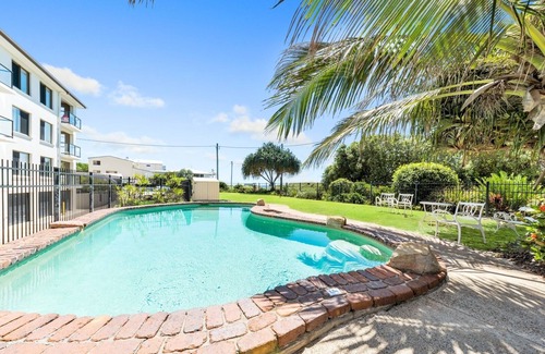 This sought-after first-floor unit is easily accessible, just one flight of stairs away, and offers stunning views of the complex's inviting swimming pool. The unit features a spacious open plan layout that combines the kitchen, living, and dining areas, all leading to a private balcony. Here, you can relax and soak in the picturesque views of the azure Pacific Ocean.