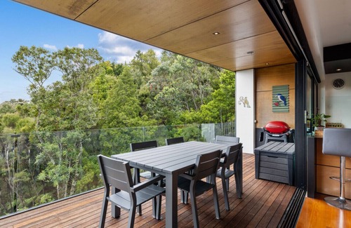 Relax in comfort and style in this 3 bedroom home with a pool that puts Paihia and the Bay of Islands at your doorstep while being secluded in a bush back drop with indulgent sea views. This is barefoot luxury set in tranquility. Enjoy the huge outdoor deck, indoor or outdoor dining, a wonderful kitchen and the best technology. Only 3 minutes drive to Paihia. A 2 car garage is available, An additional ground floor apartment which sleeps 2, is also available to book.