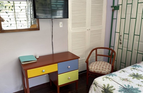 A relaxing, private pool view room with en-suite bathroom in a charming Mid-Century villa and guesthouse, which was built in the 60's. The room is decorated in a calming tropical theme. Everything the savvy traveler expects is available: AC, TV and all essentials. Continental breakfast included.