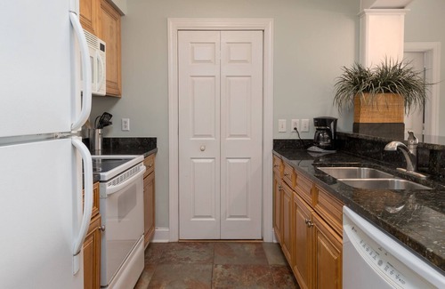 Overlooking the lagoon, it has two bedrooms with recently renovated ensuite bathrooms, wifi, and a fully stocked kitchen. Located in the best and most quiet part of the community, you can enjoy its two balconies, open vaulted living and dining room, and community pool. It includes an open living plan with high ceilings and spacious seating, decorated in calming ocean blues. Its fully stocked kitchen has granite countertops and is stocked to ensure you have everything you need while you vacation. Located just off the living room, it has a breakfast bar with stools and is open to the living area. Washer and dryer in unit makes it a breeze to keep clothes and beach towels clean.