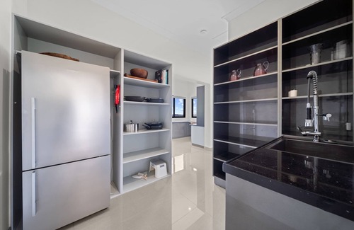 Behind the kitchen, you'll find a well-equipped butler’s pantry with a second fridge and a convenient powder room. Further beyond is a dedicated laundry space with a front-loading washing machine, dryer, and a cleverly integrated office area that captures the spectacular views. Step outside the pavilion and you’ll discover a BBQ area with an outdoor seating area, perfect for enjoying sunset happy hours against a breathtaking natural backdrop.
