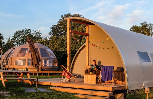 Ultimate Glamping Experience in a Uniquely Shaped Tent – Perfect for Stunning Photos!Stay in our Panorama Lodge and enjoy a festival-style getaway like no other! This lodge offers cozy, sheltered sleeping cabins while the open-concept living area lets you fully embrace the Twente outdoor experience in a vibrant park setting.The lodge features comfortable beds, a cozy sitting area, and private sanitary facilities. It also has a private terrace and a kitchenette, equipped with:DishwasherCoffee filter machine (No. 4)Fridge/freezer combinationKitchen inventory (kitchen linen available for booking)The sleeping cabins and bathroom are enclosed for privacy, while the living space is covered yet open, allowing you to enjoy nature’s sounds—like birds chirping during dinner!The lodge includes two bedrooms:One bedroom with a double bedOne bedroom with a single bed and a bunk bed (suitable for children up to approx. 12 years old)Space for a baby cot if neededLocated near several play areas, this is the perfect spot for a fun-filled family getaway! Our Panorama Lodges are spread throughout the park—want a guaranteed spot at our pop-up glamping? Be sure to mention your preference during booking!