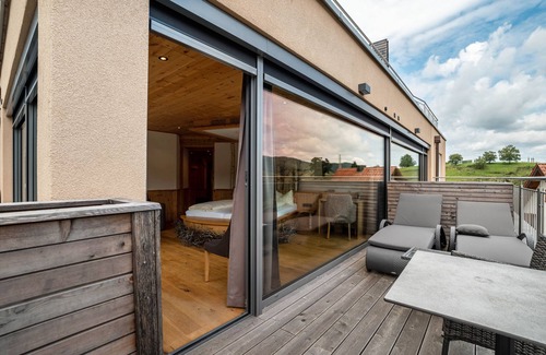 The furnishings are made of restored old wood from the Black Forest, and the stone pine wood emits a pleasant fragrance. The room has a terrace with a beautiful view of the Bühlertal, the vineyards and the Black Forest. The interiors are step-free and conveniently accessible by elevator.
