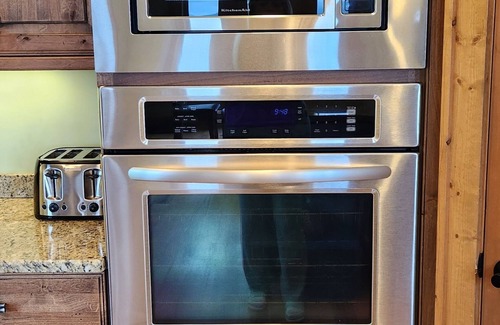 On the first floor/main level, you will find a spacious living room with breathtaking views and a beautiful stone fireplace. The high end custom kitchen is fully equipped with everything you need, including a double oven, microwave, gas range, air fryer, crock pot, electric can opener, blender, rice cooker, roaster, spice rack, VERY sharp knives and all the baking/cooking/serving dishes, utensils, kitchen gadgets and tools you need to cook a meal for a dozen people. In addition, there is a walk in pantry to store at least a week of food for a dozen people. The main level also features a master bedroom with a log king bed and private bath.