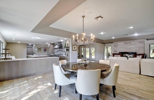 Come and unwind in this peaceful country like setting that is convenient to everything Austin has to offer. This old ranch style home has been completely modernized throughout. Limestone patios in the front and back plus a pool. There are 3 bedrooms and 3 full baths, 1 kingsize bed, 1 queen and 2 twins and one pop up queen bed. The modern kitchen features six burners, two ovens and a large island. There are many deer, birds and other wildlife, but downtown Austin is just a short drive away.