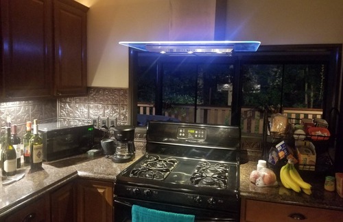 Relax in the huge hot tub or in the cozy couch overlooking the trees and animals thru the panoramic glass walls. kitchen overlooks living room and panoramic view on one side, while other views large deck, jaccuzi, and dinning table. nice hardwood floors thru ought.