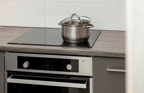 Induction hob, oven, fridge with freezer, dishwasher, kettle, coffee maker (pour-over), microwave, kitchen and tableware.