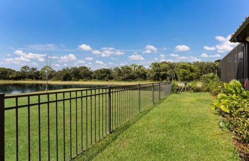 Situated in the West Villages, one of the best master-planned communities in the country, this nearly new build in Gran Paradiso blends tranquil lakefront living with an inspiring coastal-infused interior design. One of the best homesites available WITH 270-degrees of water views and natural splendor just beyond. Step inside through the screened front porch to the open-concept layout, adorned with ample upgrades including upgraded light fixtures and fans, crown molding, and tile on the diagonal. The host in you will love entertaining in the great room, including dining, living room, and open kitchen. Explore your culinary creativity in the gourmet kitchen, adorned with breakfast bar, crisp white cabinetry, granite surfaces, and stainless appliances. Winding down everyday becomes a cherished ritual in the master suite, offering lake views, walk-in closet, and spacious master bath. Three additional bedrooms provide comfort and privacy for loved ones. Perfect for sun-drenched afternoons, head out the shimmering heated salt water pool & jacuzzi. Your favorite tunes create a relaxing setting played from the sound system. Gran Paradiso is a resort-style community with pool, tennis courts, pickle ball, fitness trails, and state-of-the-art fitness center. Right across the street is the Atlanta Braves Spring Training facility at the CoolToday Stadium. Close to all shopping and only 10 miles to the beach.