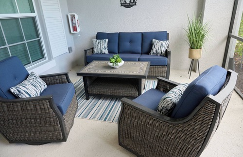 The open floor plan connects the living, dining, and kitchen areas, providing a versatile space for various activities. Whether you are hosting a lively dinner party or enjoying a quiet evening with a book, the layout offers both entertaining and relaxing environments. The back lanai offers a view of the lake and morning sunrises, while the front lanai provides a space for afternoon gatherings with neighbors. The primary bedroom has a King bed, smart TV, ensuite bathroom with dual vanities, large walk-in shower, and his-and-her closets. The guest bedroom includes a Queen bed and smart TV. The den offers a sleeper sofa and a work desk.
