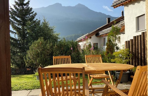 The wonderful, furnished terrace with magnificent mountain views faces south. Morning coffee in the sunshine is a special treat on the rustic Swiss stone pine bench.