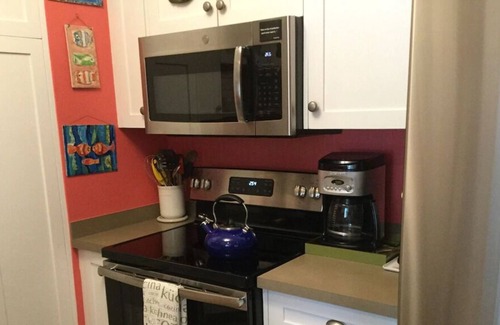 A red aluminum roof makes the cottage quickly identifiable! The cabana striped awnings, bright tropical artwork and furnishings complete the charm of old Florida living with contemporary amenities. Cottage has 2 decks - one that looks at Boca Ciega Bay and a second intimate, secluded, covered porch between home and the garage (loft). A privacy fence on both sides of the home. Old oak wood floors, a totally remodeled and updated kitchen, romantic fireplace, ceiling fans, central air, This is our personal guest house for our friends and family when they come visit, so we make sure it never starts looking 'tired'.