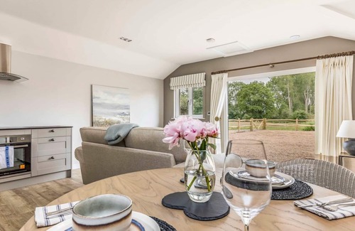 This charming stable conversion offers cosy accommodation with a king bedroom and en-suite shower room. The kitchen is well-equipped and spacious and is open plan with the sitting room and dining area. A large bi-fold door fully opens with views of the the meadow beyond! Retire to the comfortable sofa after dinner for a relaxing movie night in. Outside is a small patio area with table and chairs, perfect for enjoying a morning coffee or a sundowner.