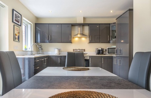 Really spacious detached new build in an incredible location. It really is so unique to have this much space in this part of town. Downstairs you can enjoy a wide open living space/dining table and kitchen with plush sofa and TV to catch up on your shows! There is also a separate utility room with washing machine, dryer and W.C. Double doors leads to outdoor patio with log burner (you must supply your own firewood) and outdoor seating. Upstairs you will find three large bedrooms (one king and 2 doubles) with a separate workspace and three bathrooms. Loads of room for family or small group of friends.