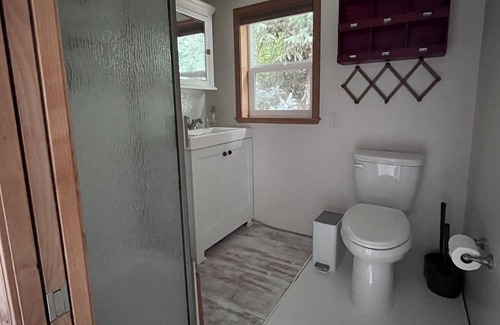 Moonshadow Cottage is a standalone structure on the property that affords plenty of privacy. It is a large space with a private bay of windows that look out from the bed to the forest. There is a wood stove for fires on cold nights, and a *kitchenette* with a Ninja air fryer / toaster oven, sink and mini fridge.