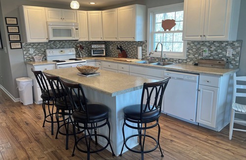 Completely renovated home with 3 bedrooms and 2 full baths. One king bed, one full size beds, three xl twin beds. Fully stocked kitchen. Rocking chair front porch overlooking huge yard with fire pit and amazing views!