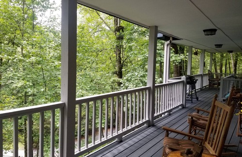 Drive through the covered bridge over the Watauga River (where you can swim) to find this newly renovated mountain home. It is a 2 bedroom 2 bath + a bunk loft (sleeps a total of 6). Conveniently located between Boone and Banner Elk. As you come up the driveway, the double decks immediately catch your eye. Enjoy stunning mountain and forest views from both covered decks with lots of comfortable seating, a gas grill and swing. On the ground Adirondack chairs and a fire pit are waiting for you.