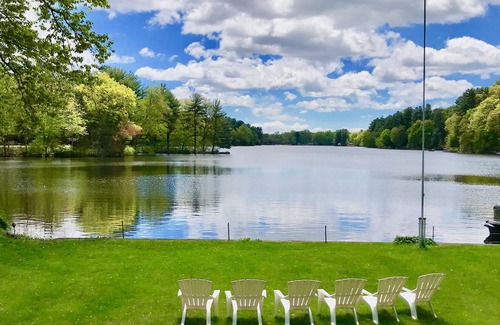 Relax and rejuvenate in this beautiful lakeside home only an hour from NYC -- perfect for a friends and family get-away or work-cation! This lake-view home includes 2 fireplaces, a fire pit, 4 bedrooms, a private loft, and 2 full bathrooms, living room, dining room, family/media room, and a home office -- all freshly cleaned, disinfected, and waiting for your friends and family gathering. The huge terrace with Weber gas grill, hammock, lounge chairs, fire pit, shuffleboard, corn hole, is perfect for outdoor fun. TONS of hiking, X-country skiing, and biking trails in the area, plus orchards, winery, breweries, and restaurants. The house sleeps 8 guests (see details). The living room is full of natural light from the large south-facing picture window overlooking the lake and also features a huge stone fireplace for gathering around. The newly renovated kitchen with granite countertops has an island for foodie group cooking. The well-equipped kitchen opens up to the dining room with a stunning one-mile view of Pinewood Lake. The home office is a great place for a private zoom calls – or an introvert’s escape. Wifi is newly upgraded to Frontier's "FiberOptic Gig Service" with a "25x faster upload speed than cable" and noted "best internet service for gaming" -- so stream, zoom, game, and binge-watch...or read a book. Located in beautiful Fairfield County, CT, in a suburban neighborhood, the Amtrack/MetroNorth (Bridgeport) station is about 13-minutes away. This host is delighted to assist as you plan your get-away. Please inquire about lake access for Pinewood Lake Association's "tenant membership" (only one granted per calendar year). The lake itself is not part of the property and requires membership for access (swimming, boating, and fishing). Note: This property is NOT listed on any other platform as a rental.