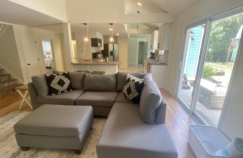 Beautiful saltwater pool home with room for the familyand fido! Just a short drive to area beaches, restaurants and shopping. 8.8 miles to Carolina Beach, 10.2 miles to Wrightsville Beach, 8.5 miles to Historic Downtown Wilmington. Close to parks and cross city trail, The Pointe at Barclay for movies and restaurants. Home features a first floor bedroom with King bed and attached shared full bathroom. 2nd floor features a second suite with 2 queen beds and private bathroom, and a 3rd bedroom with a queen bed across the hall from a powder room, and a loft area for hanging out or playing foosball. Upon entering the home you'll find 2 cozy living and entertaining areas that flow into the open kitchen and dining room which comfortably seats 6. Out back you'll find a lovely yard with salt water pool, palm tree, hammock and mature live oak. Choose from any of our many outdoor seating/gathering areas! Home is pet friendly for well trained dogs.