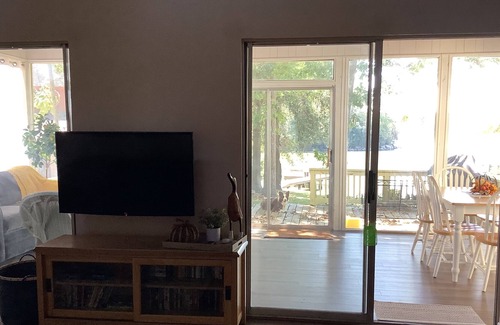 The Riverhouse is a lovely 3 BR, 2 Bath waterfront home situated on an inlet of the Trinity River. It has a cozy living space with an additional large sunroom. Main living area has a sofa sleeper plus 2 sitting chairs, 2 large beanbag chairs and a Smart tv with Directv and Roku. A selection of games, puzzles and movies are provided. The sunroom has floor to ceiling windows with a sofa sleeper, 3 chairs and a 6-person dining table, all overlooking the deck, backyard and dock.