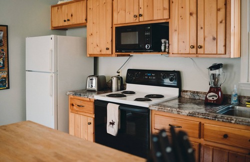 Downstairs you can retire to the two cozy bedrooms. The main bedroom has a queen bed with large storage drawers underneath. The second bedroom has a bunk bed with a full-size mattress on the bottom and a twin-size mattress on top. The full bath has a tub/shower combo and is convenient to both of the bedrooms. We provide fresh bed linens, pillows, towels, blankets, dishes, pots/pans and lots more to make you visit as comfortable as we can.