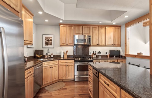 The 3,118 square foot (4 bedroom, 3 full bath) residence is a half duplex that lives like a single family home and is perfect for families with two large living spaces to spread out and enjoy. The upper level is open with soaring ceilings, large windows and a mountain modern flair. Radiant (in floor) heat as well as 2 gas fireplaces (one up, one down) keeps the entire home cozy throughout the winter. And a large dining table in the great room comfortably seats eight for dining at home. There is ample, free parking and convenience with space for two average size vehicles in the garage. And the driveway itself has plenty of room for additional parking or for the kids to play.