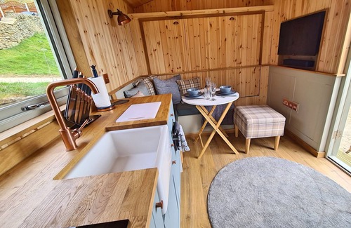 From the moment you approach our Shepherds Hut you are greeted with motion sensor exterior lights, open the doors kick off your shoes and feel right at home with warmth from the under floor heating.
