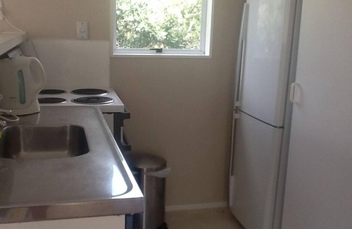 The self contained sleepout has one bedroom, lounge with a single bed and bunks suitable for children, a small kitchenette and bathroom / laundry and separate toilet.