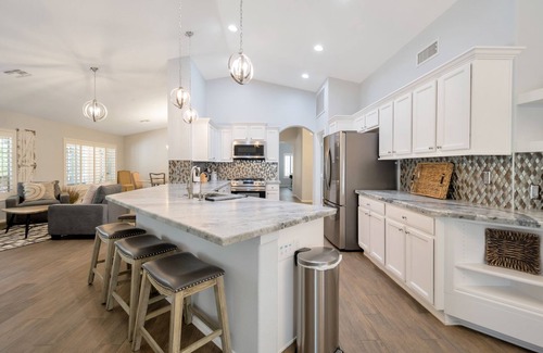 Must sign a minimum 30 day rental agreement. Rates vary. Totally updated and upgraded. This home has updated everything: carpet, wood looking porcelain floors, granite, appliances, shower and tub surround, paint, furniture, light fixtures, etc. This a 2 bedroom 2 bath home with an office. Spacious open floor plan. 2284 sq ft. Located in a security guard gated community of Pebblecreek in Goodyear AZ 85395. Community offers everything you'd expect to have in a resort: pools, golf, restaurants, bars, tennis, pickleball, bocce ball, gyms, sauna, steam room, etc. For bookings between November - April check with host as we look ideally look for a 3 month minimum rental.
