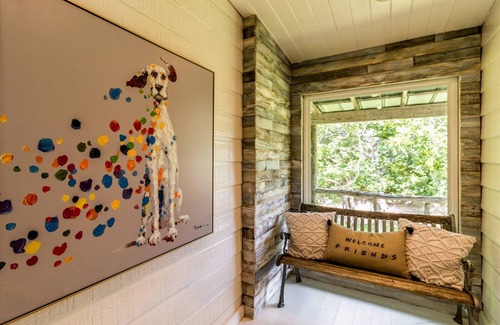Pecan Tree House is a beautifully remodeled home that sits on over 5 acres with majestic oak trees, cypress, trees, and plenty of pecan trees. A large covered front and back porch frame the house offering picturesque views. Inside the home, find an open floor plan with a dine-in kitchen, an abundance of natural light, vaulted ceilings, with reclaimed wood, and barn wood wall accents. The cozy living space offers a great mix of texture and color: a rich leather sofa, fireplace, unique decor and colorful and fun artwork that are sure to bring smiles. The kitchen is fully stocked with stainless steel appliances and all that is needed to prepare family favorites. An added bonus washer and dryer are available for guests to use. The Master Bedroom has a large walk-in closet ,ensuite bathroom with clawfoot tub and shower. The King bed is dressed with luxurious bedding and a tufted leather headboard. A unique rustic tin ceiling frames the room and a private exterior entrance is the perfect place to stargaze with a glass of bubbly. The second bedroom hosts a queen bed with comfortable linens, a small sitting area perfect to relax with a good book. The ensuite bathroom has a walk-in glass shower and plenty of counter space. A private exterior entrance to the back patio is the perfect space to bird watch or enjoy a morning cup of coffee.