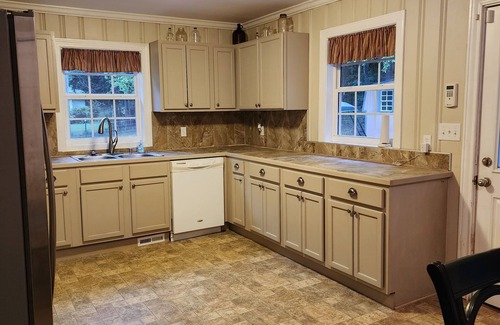 Come and stay south of the city in a semi-rural area with a large fenced yard. Only 18 minutes into downtown Greenville where you'll find loads of good restaurants, good music, and shopping. This fully-equipped cottage is named for the lady who built the house with her husband in the 1940's, and my mother-in-law's neighbor & friend for many, many years. We added the deck on the back to enjoy the outdoors - there's a firepit and a gas grill for your use also. Two bedrooms, each with queen beds and one bathroom that has a tub/shower and a heated towel warmer. There's a dedicated office area off of the eat-in kitchen, a laundry closet and plenty of counter space. Lots of mature trees on the property, and a there's a pond right across the road where you can see the occasional heron or ducks & geese. You will love the quietness of the "country" while being close to all that the city of Greenville has to offer.